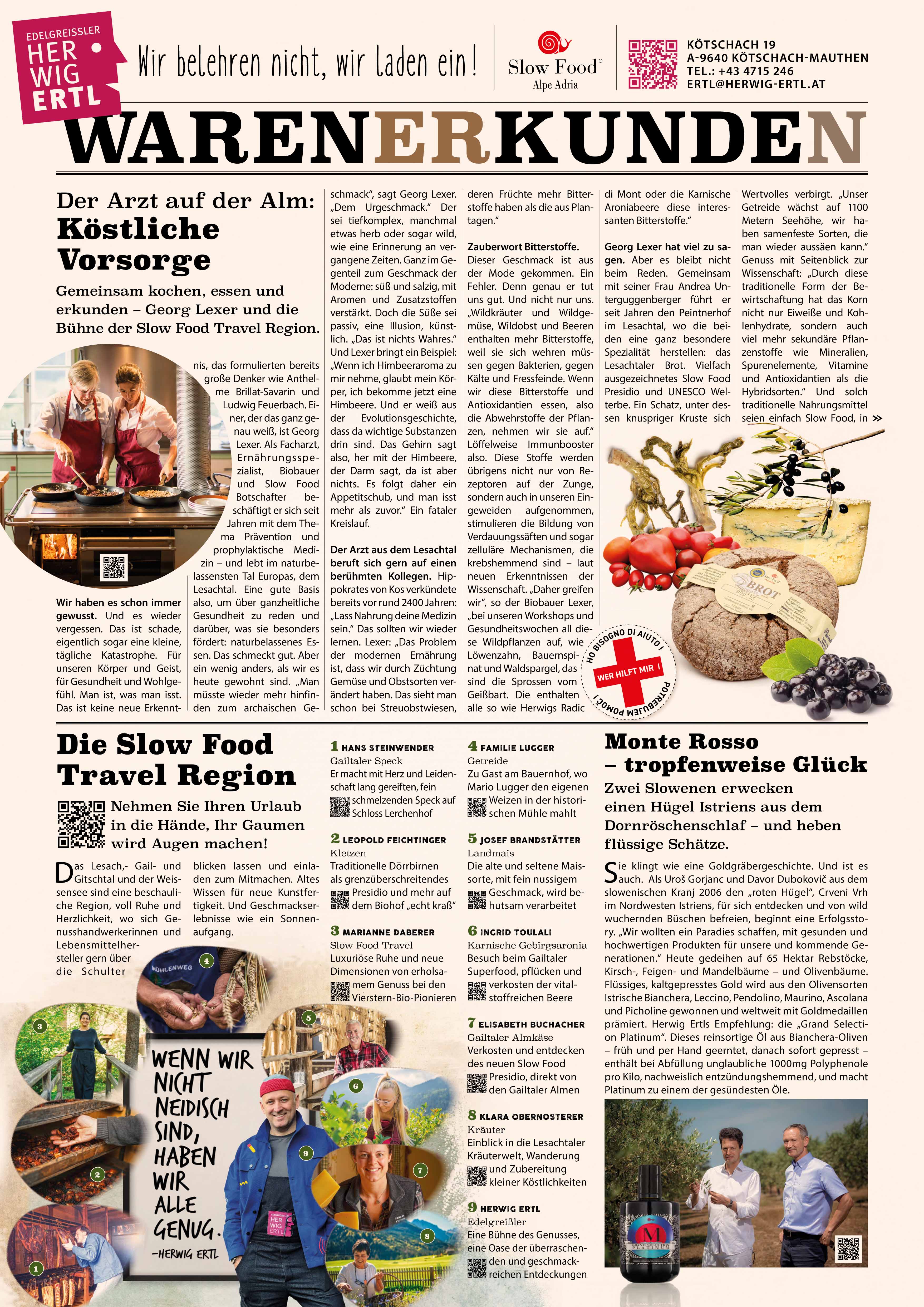Seit vielen Jahren bricht der unermüdliche Streiter für bewussten Genuss statt kulinarischer „Ready mades“ eine Lanze für die Köstlichkeiten seiner Heimat, die laut Ertl ganz und gar nicht „bei der Landesgrenze aufhört“. Er setzt sich für lokale, ehrliche Produzenten ein, bringt den Besuchern seiner „Edelgreißlerei“ im Herzen von Kötschach-Mauthen neue und unerwartete Geschmackserlebnisse näher und hat nicht zuletzt den Vorsitz des Conviviums in der weltersten Slow Food Travel Region in Kärnten über. Herwig Ertls Begeisterung steckt an, er veranstaltet auf seiner „Bühne des Genusses“ ein jährliches Genussfestspiel, er knüpft Kontakte, macht Mut zum Querdenken, macht Lust auf neue Wege.
